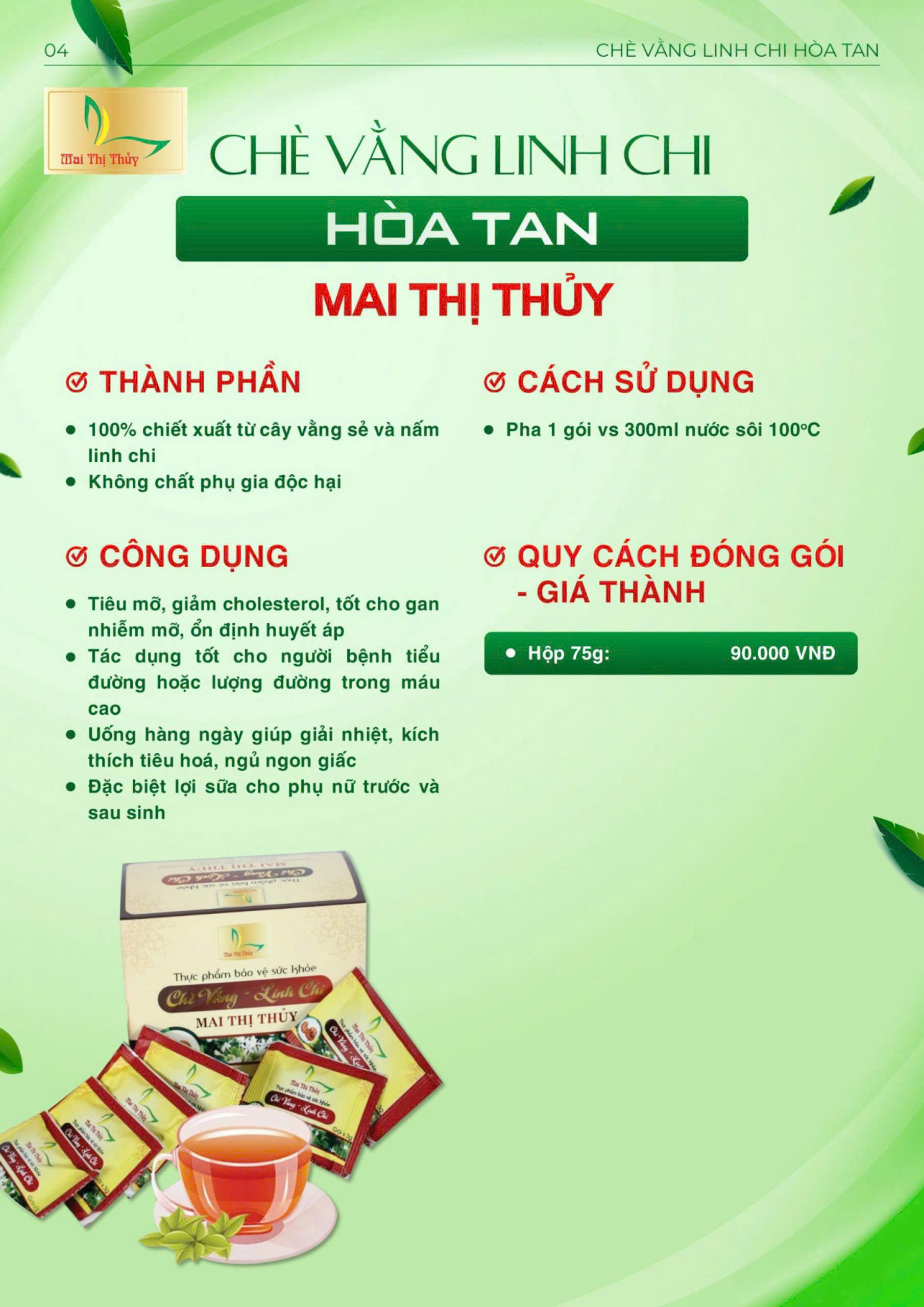 - Pha 1 gói với 200-300ml nước nóng ( 90-100°C ), hoặc có thể pha đậm hơn ( một gói với 100ml), khấy đều. Có thể uống thay nước hàng ngày.